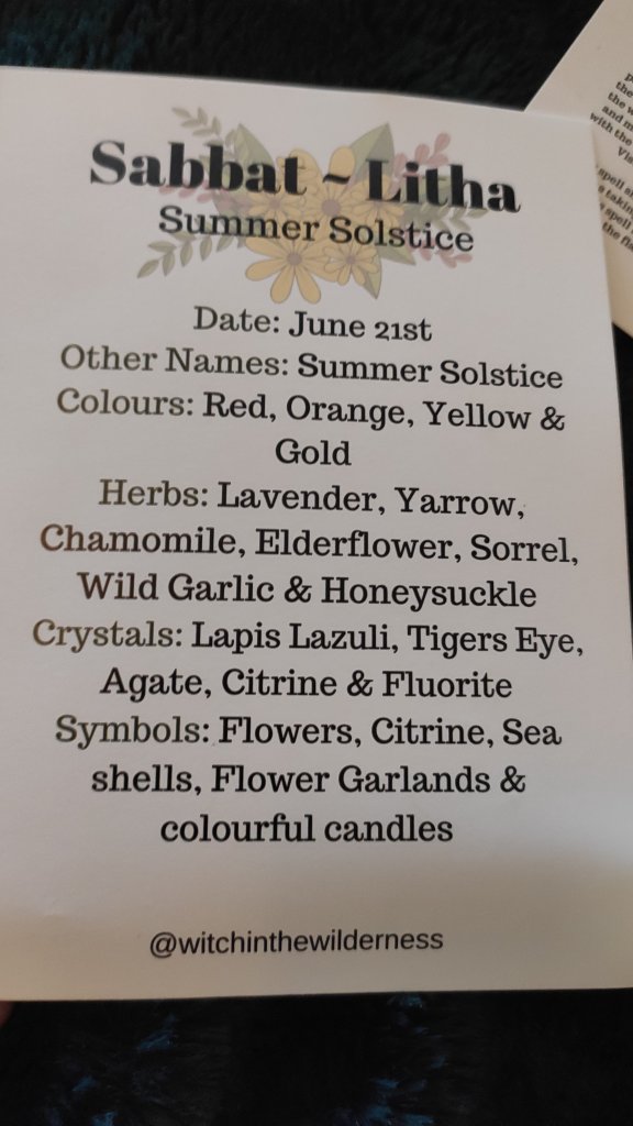 We have a written success spell scroll (won’t show it incase it’s copyrighted). A couple of cards with the crystal, colours and flowers and herbs correspondences, and also one for a Litha ritual too. (Again won’t show the ritual card in case it’s copyrighted)