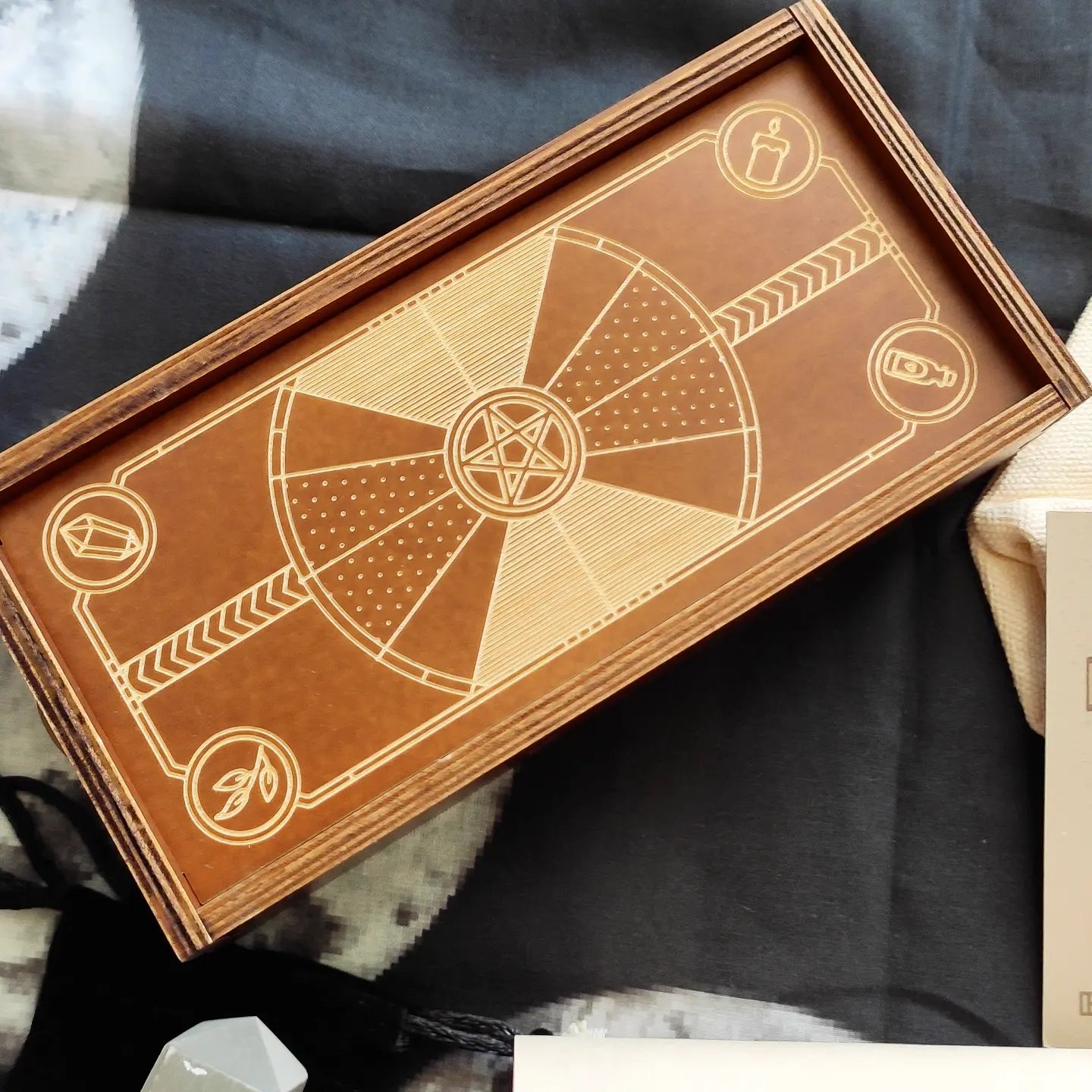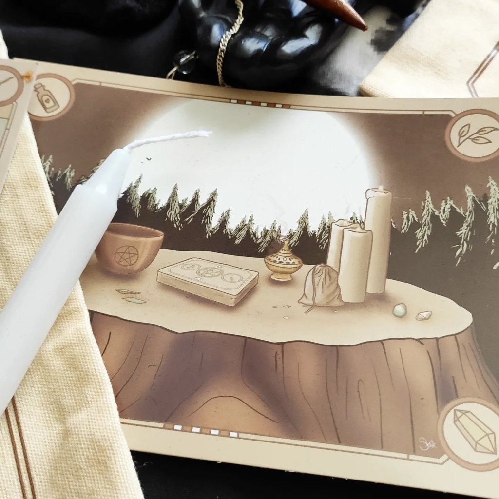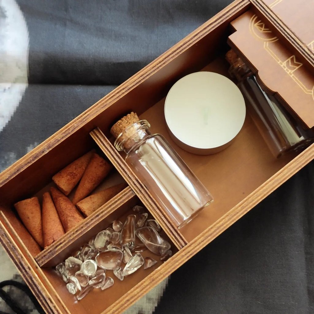 Wooden Travel Altar, when you are headed outdoors to practice or off away for a getaway, you can take this small portable altar with you. Inside they have provided 2 spell bottles, some incense cones in sandalwood for spiritual cleansing and purification), a tealight and clear quartz chips ( as clear quartz can power up any spell or ritual. I’m going to add a feather for Air, use Incense for Fire, Sea glass for Water, and Herbs for Earth. I can’t wait to add my own touches.