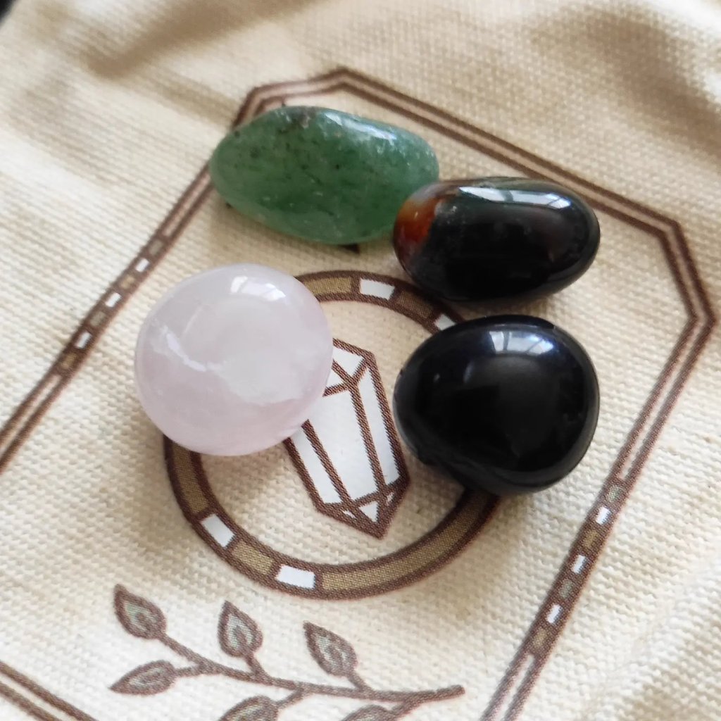 Essential Crystal Set in a custom pouch. Added inside is Rose Quartz for love peace and compassion, Green Adventurine for success, motivation and balance. Black Agate for banishing, cleansing and protection. Bloodstone for energy, confidence and courage.