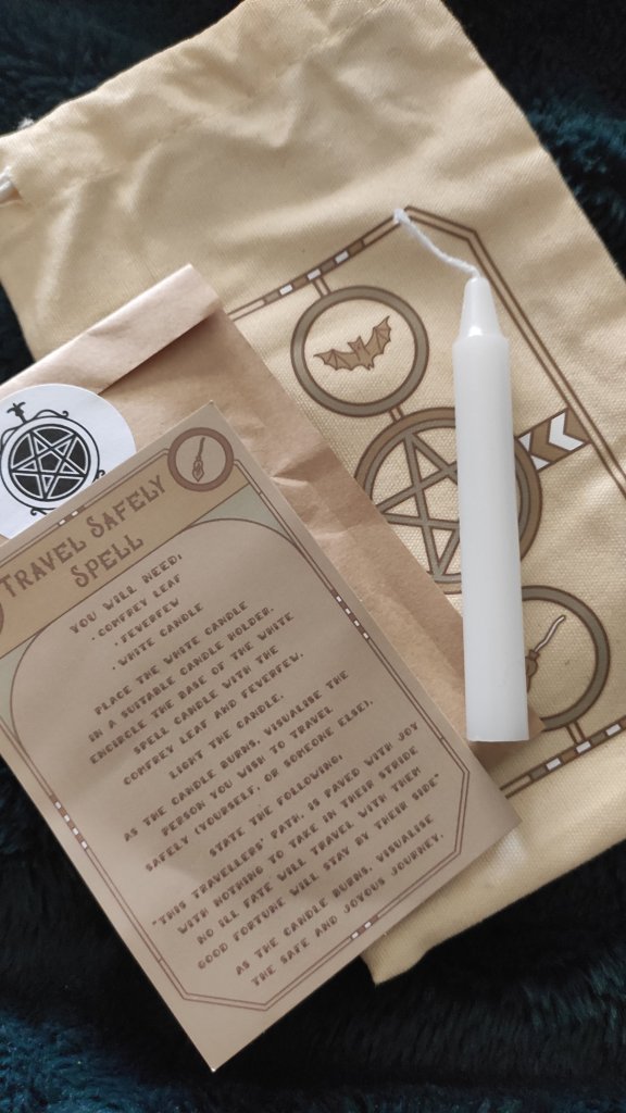 Travel Safely Spell Kit a cute custom pouch contains you need to cast this travel safely spell for yourself or a loved one. Inside contains a White Candle, Instructions, and Comfrey Leaf/ Feverfew blend.
