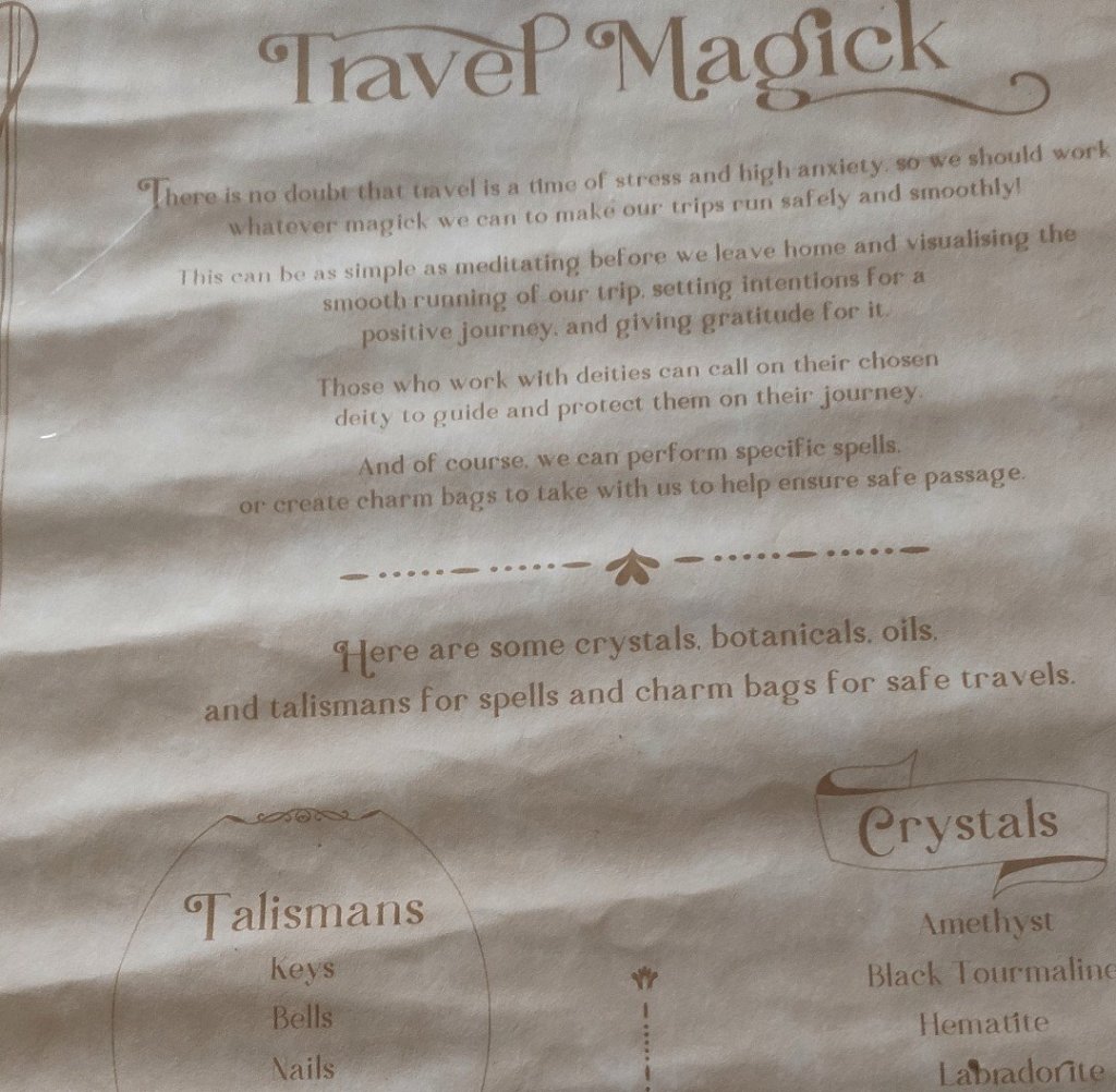 Scroll this month’s parchment tells you of the crystals, the botanicals, the oils, and talismans that you can use in your magickal workings and charm bags for safe travels.