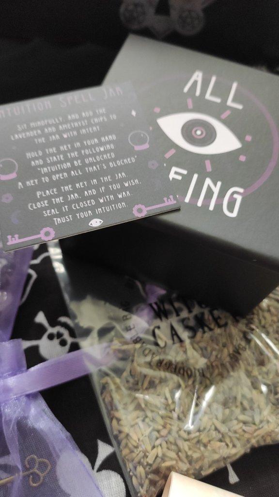 A little snap shut magnetic close box, beautifully decorated with all seeing eye. Inside is the ingredients to make your own spell jar,to increase your spiritual intuition. Tiny Key, Lavender, and Amethyst chips and Tiny bottle included.
