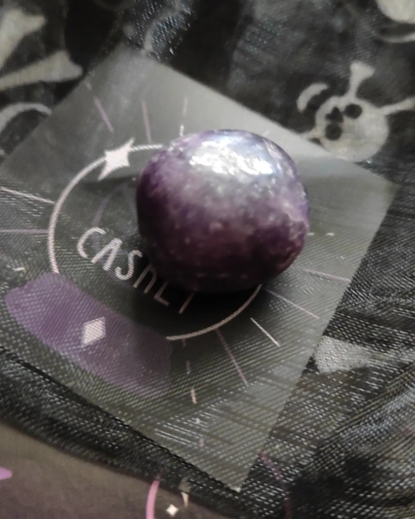 Some incense sticks were tucked nicely inside and the information scroll. And finally the crystal of the month is one I’ve never had before a Lepidolite.