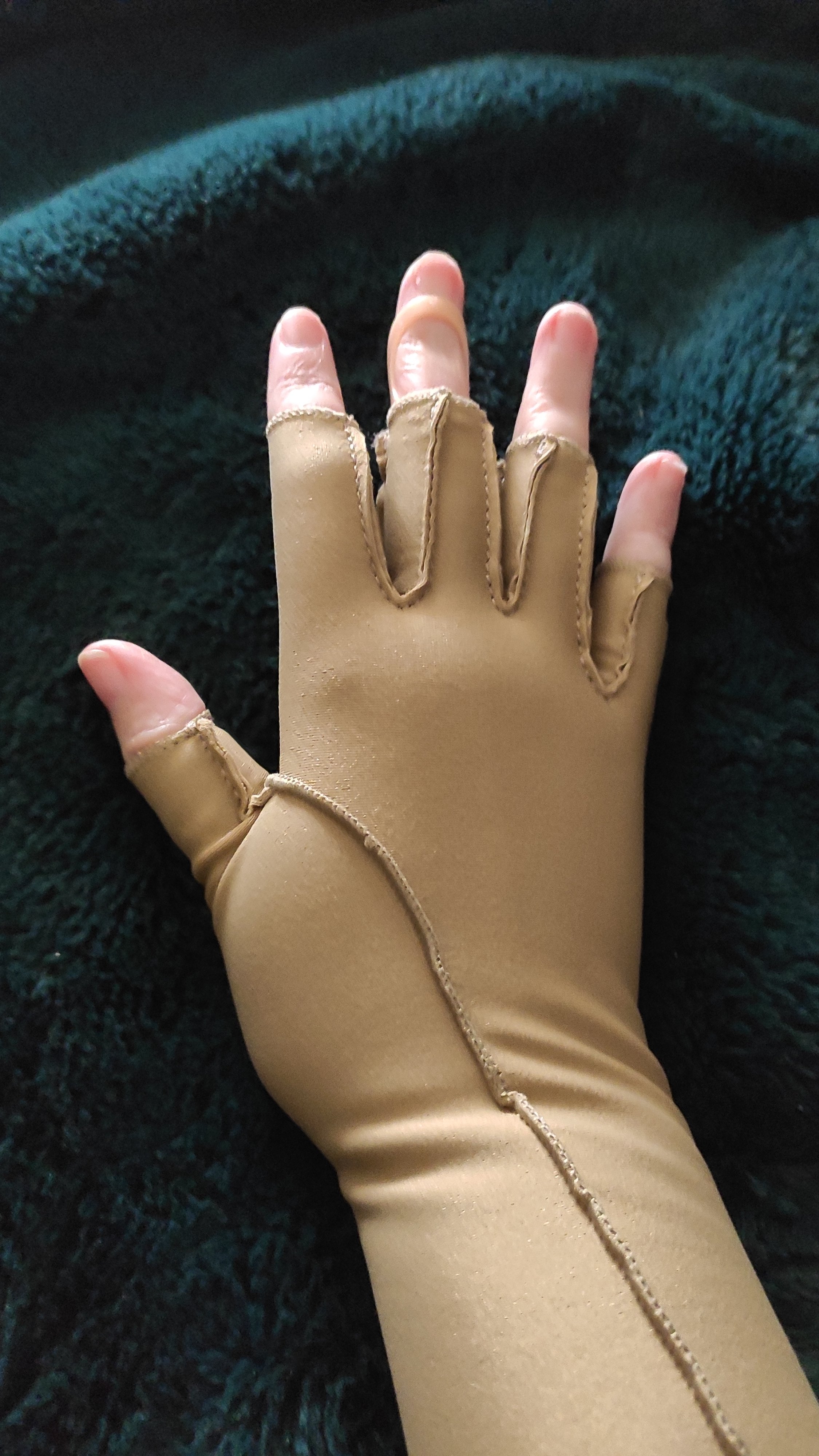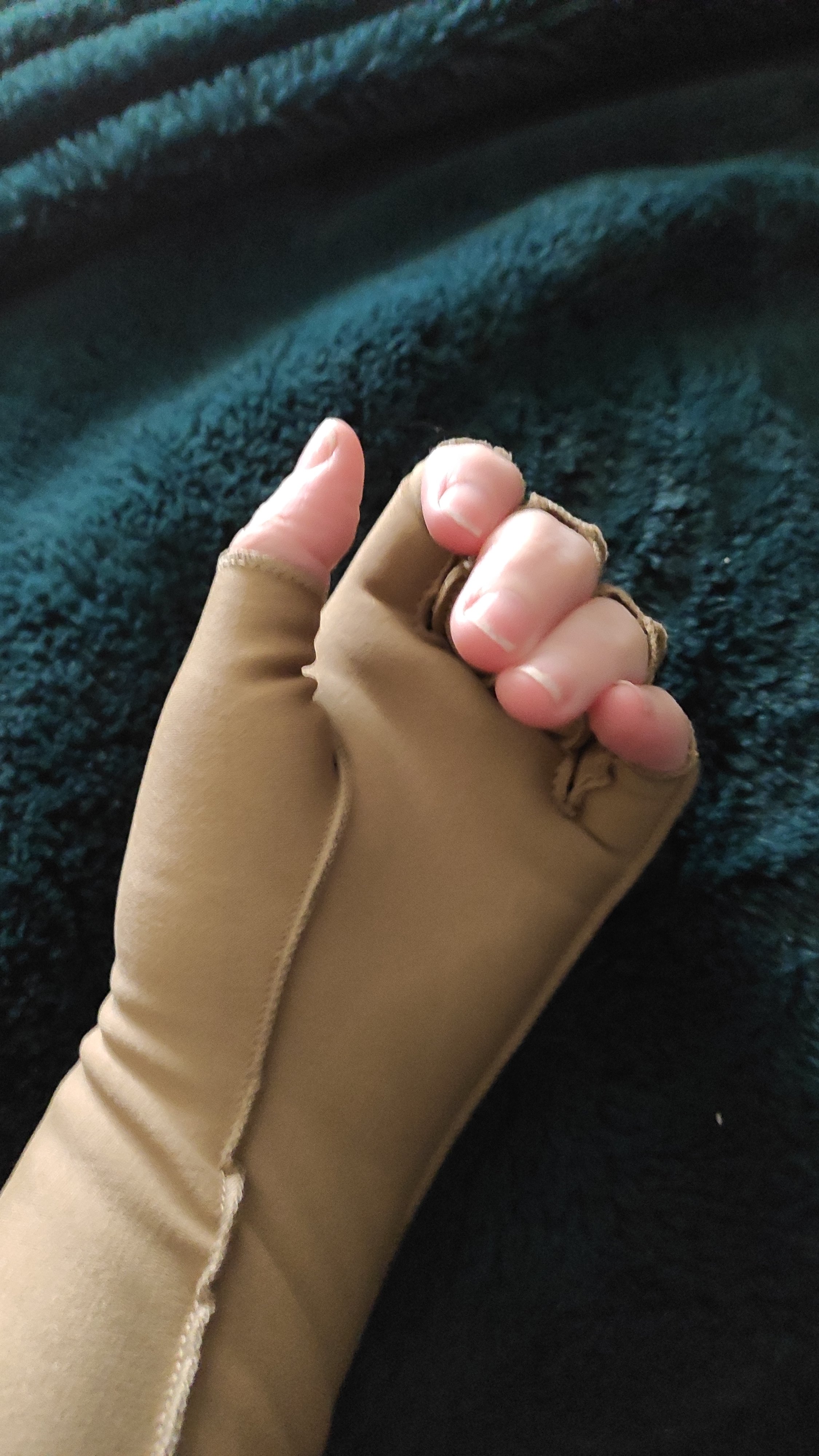 It’s been a few months since I last had a pair of compression gloves, and they’ve lost their pressure. As my steroid ( done 14 weeks ago this week)has no worn off entirely in the right hand, the braces are back. But at night time it’s easier (no velcro catching on bedding) to wear compression gloves.