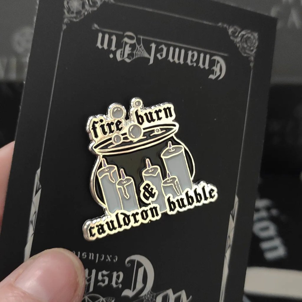 This month’s enamel pin badge is Fire Burn and Cauldron Bubble, I think this one is my favourite.