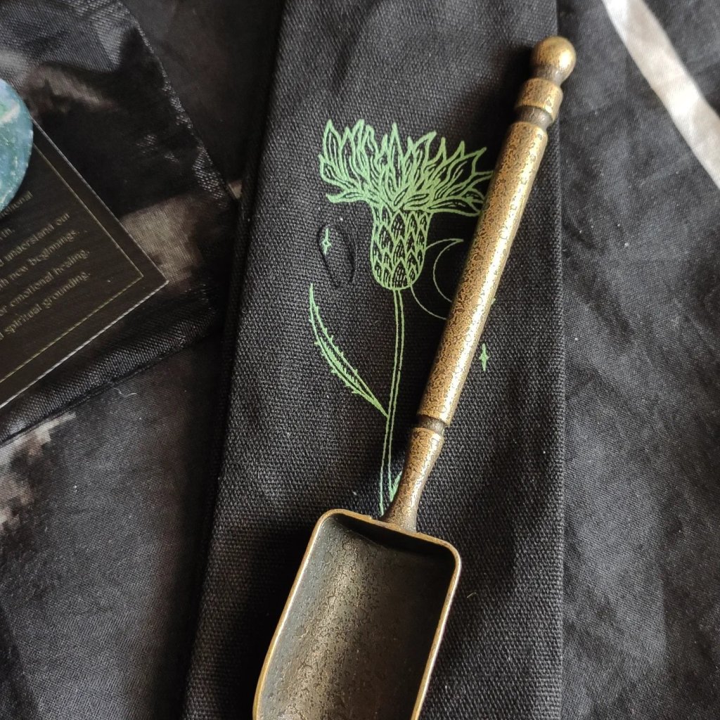 In a beautiful pouch with a thistle on, we have a brass coloured metal scoop, to use to gather our dried herbs out of tubs.