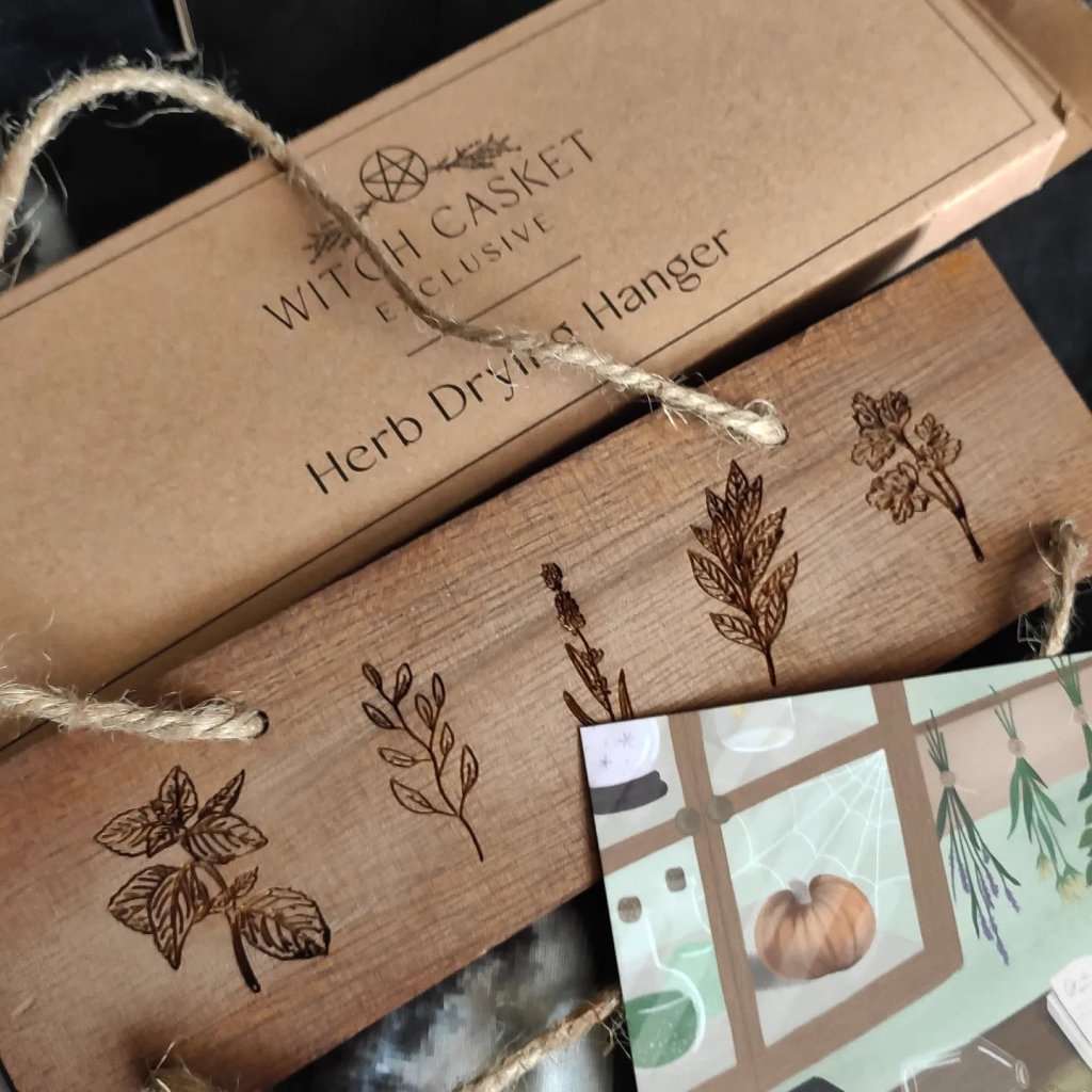 A wooden and twine herb hanger, allows you to grab small bunches, with a small space between them, to hang upside down in a dark cool dry spot. Included are 4 small wooden pegs.