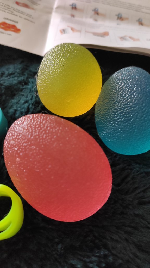 Hand balls, these help strengthen hand and finger flexibility. 3 colours show the different levels of strength resistance. Yellow 10kg/22lb Red 20kg/44lb Blue 40kg/88lb squeeze the ball with it in the palm of the hand, or squeeze between thumb and fingers 10 reps