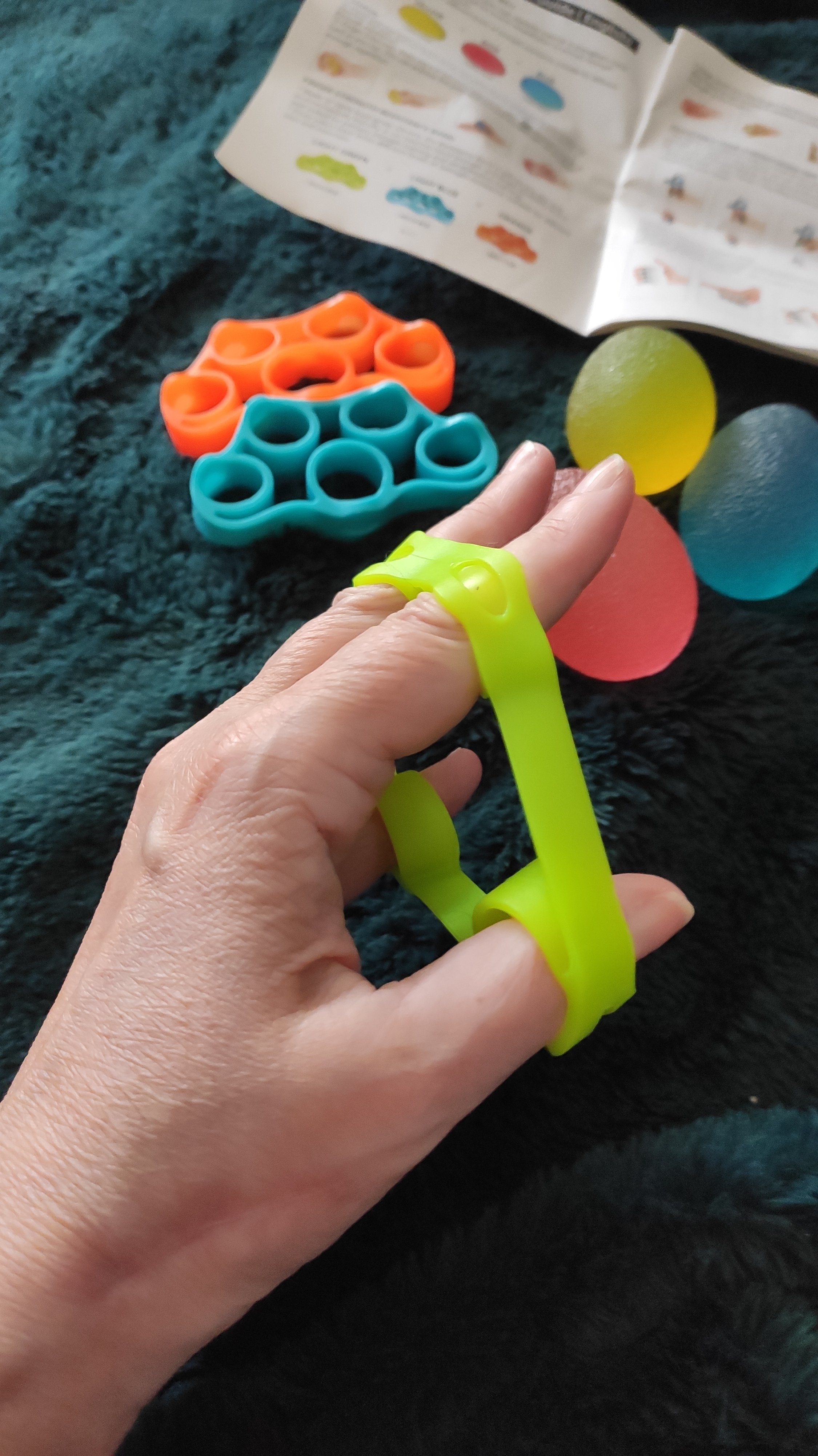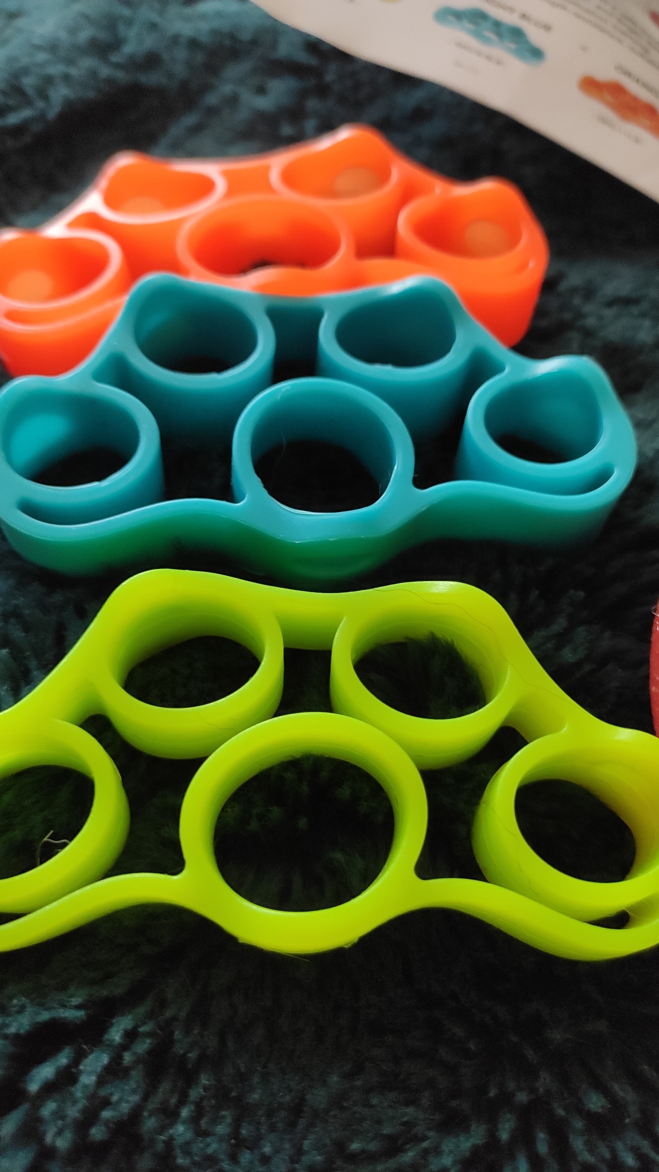 Finger Strength Resistance Bands, once again graded in difficulty using colours. Green 3kg/6.6lb Blue 4kg/8.8lb Orange 5kg/11lb place fingers into loops and expand fingers outwards. 10 reps