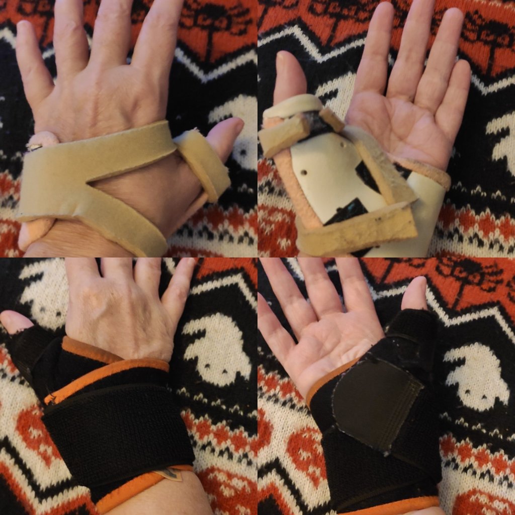 Had to dig out my old splint, which helps keep it from being knocked especially at bedtime. And the opposite hand is back in a brace too 🤦🏻♀️🥺 but better to protect them now, while I can.