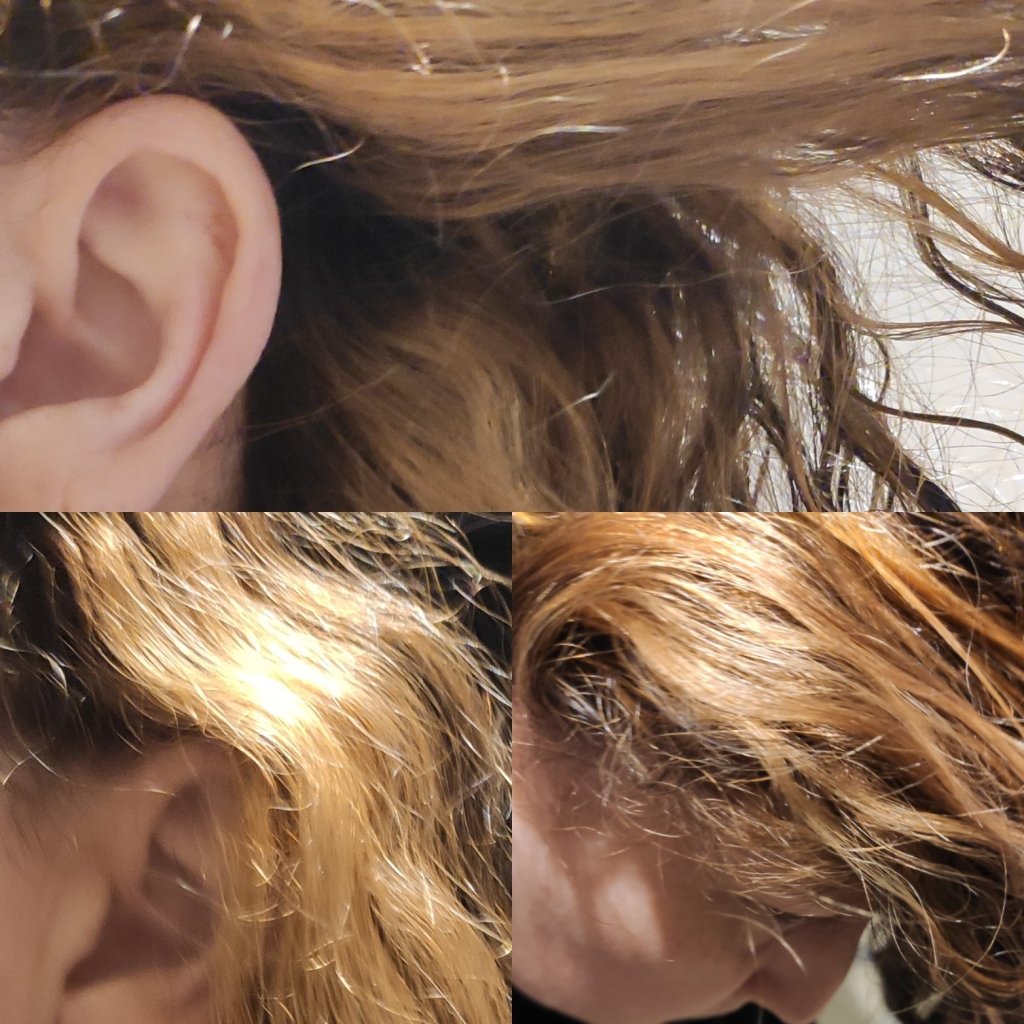 Some patches of hair hid, as I have extremely dense thick dark hair, so need to rebleach with the other sachet and last of the bottle. Which I will do the next day. After each bleach session I use the purple shampoo and hair mask provided.