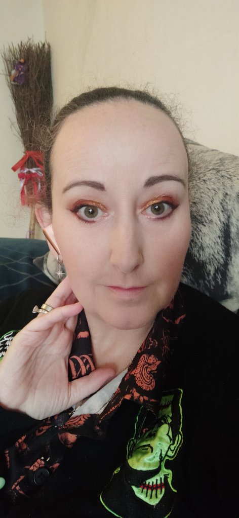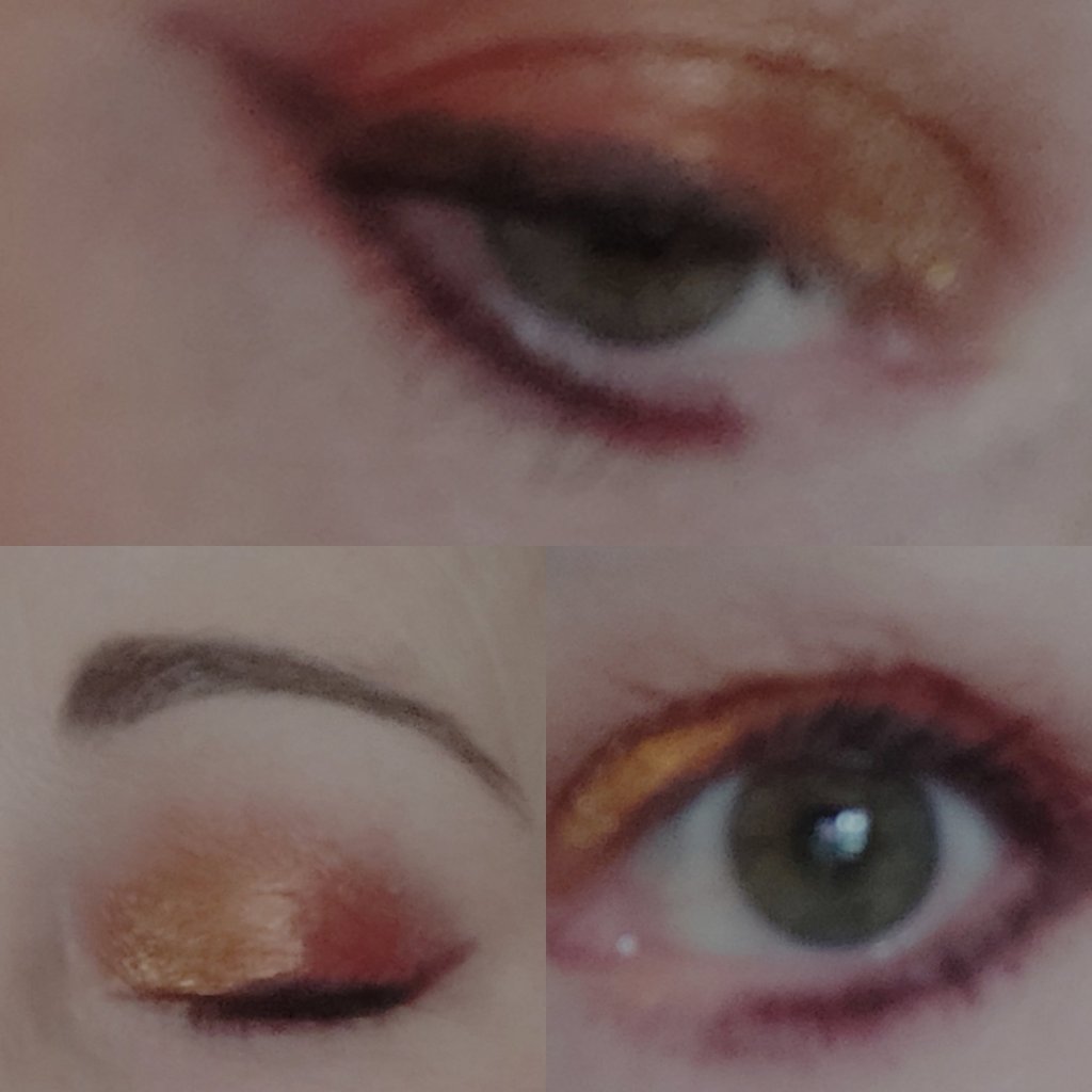 Not the best photos but I’m new to that. I used the colours Grave Danger an orange, and Spell Check the gold glitter. Ghoul gang darkest burgundy for eye liner.