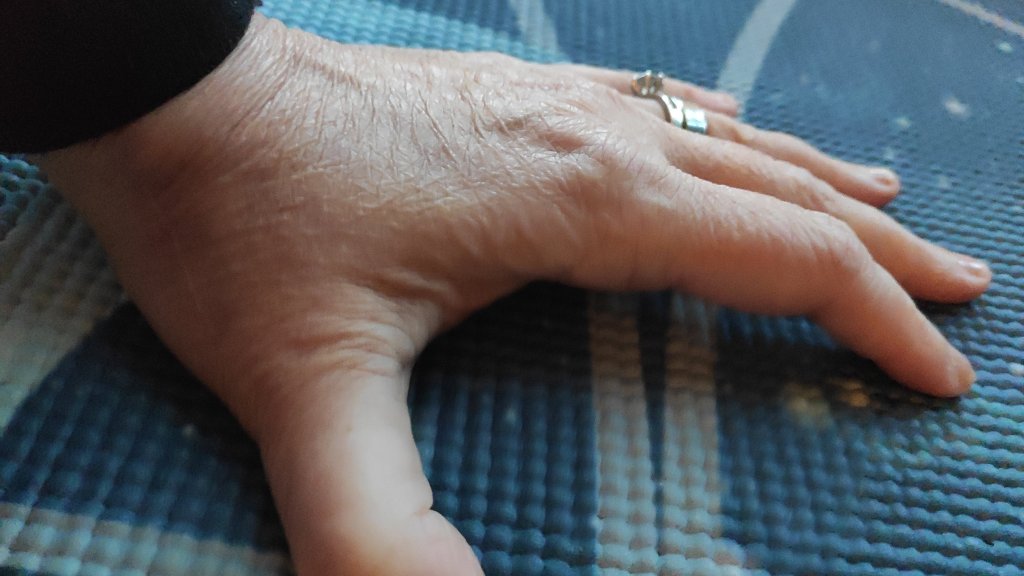 This is how flat I can get the fused hand down on the yoga mat, you could slip a finger underneath the palm, not ideal but one way I’ve had to adapt to do the things I love. If I’m doing some planks and the wrist is achy, I go down to forearms to be more stable.