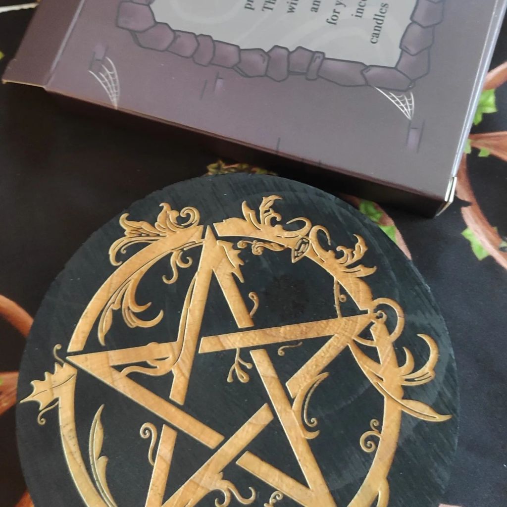 Wooden Pentacle Ritual Tile, the perfect tile to rest your chalice, or add herbs to infuse with energy and intent, or use as a title for spell work. It’s light weight, easy to carry and great for workings away from home too. I’ve put my offering bowl on mine.