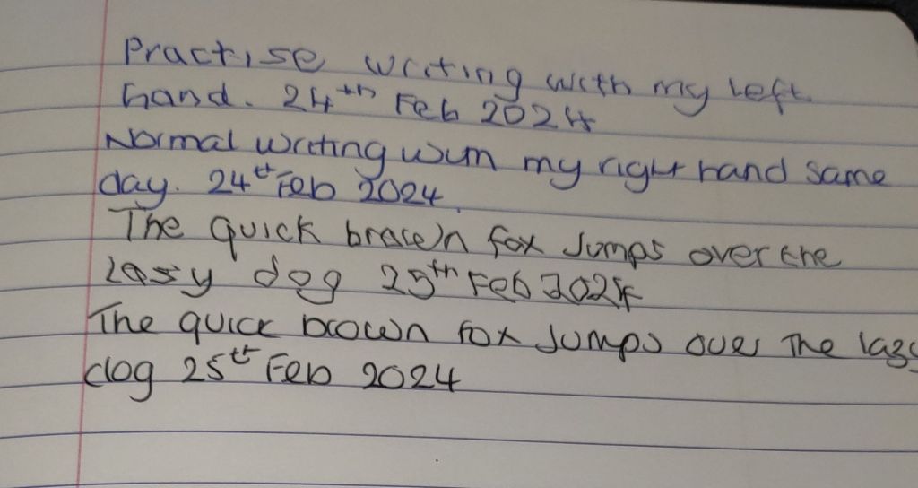 I’ve started to practice writing with my left hand, as I’m a notorious diary keeper and list maker, and it dawned on me I wouldn’t be able too, so I’m attempting writing with the left, with some hilarious results.