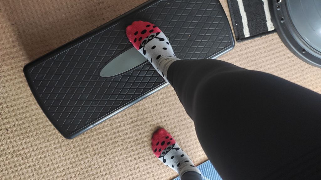 At home I have crutches for extra stability while trying to balance on one leg, an Aerobic Step, a Bosu Ball and Yoga Mat. I do have Resistance Bands, but honestly I don’t think I’m strong enough for them just yet.