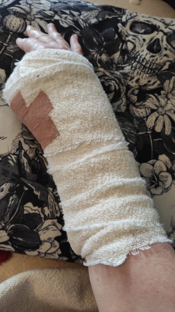 Day 12 Last day in this bandage, I will not miss the weight of it. Maybe then the elbow will heal better. Sleeping a lot better at night, but still sat upright and propping my arm up. So I long for a normal way of sleeping, and feel refreshed. As somehow I do not wake up feeling like I’ve slept all night 🤦🏻♀️ I did try it a little bit half way through the night, and it did feel better. So fingers crossed this can be the new way. We went out for Sunday dinner so I managed to put my make up on and brush my hair, even though it was difficult. Tonight I’m going to try and sleep flat all night. Second night taking 1/2 morphine tablet as I’m weaning off them before they run out.