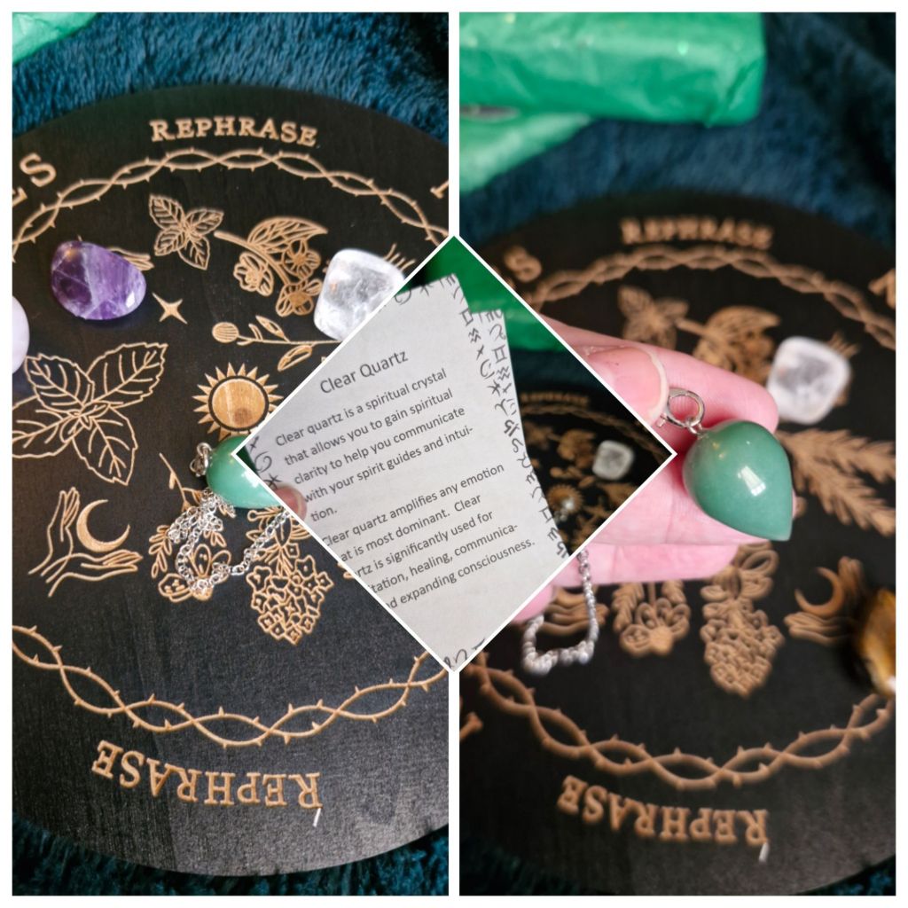 Day Four A Pendulum board with a green adventurine Pendulum, and 4 other crystal tumblestones, and the write up on each crystal properties.