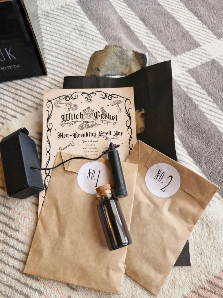 Hex Breaking Spell Kit, comes with Red Clover, Chamomile, Black Spell Bottle, Black Candle, Black Cord and of course full instructions.