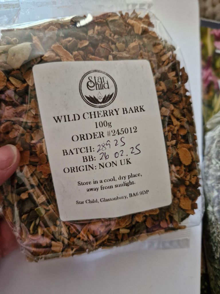 I saw on Star Child Glastonbury shop that Wild Cherry Bark and Coltsfoot were excellent herbs to add to Mullein. And after one extremely terrible night of non stop coughing, I ordered some online find Here for Coltsfoot and Here for Wild Cherry Bark
