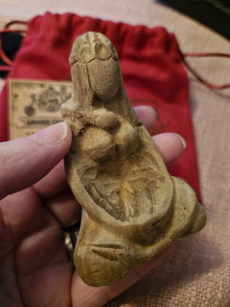 Hand finished Wooden Goddess Crystal Holder, made from Acacia wood, represent the goddess/divine feminine it can hold a small Crystal or rune or talisman too.