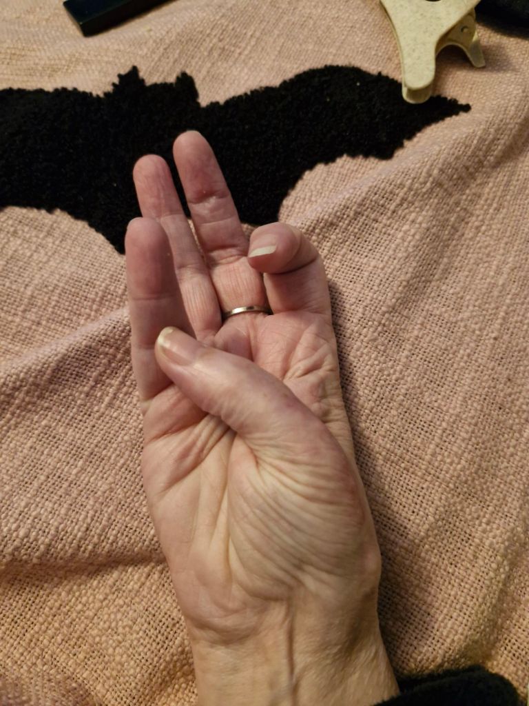 I can pretty much touch the bottom of the pinky finger, however I don’t feel like the top joint flexes enough, but we keep trying.
