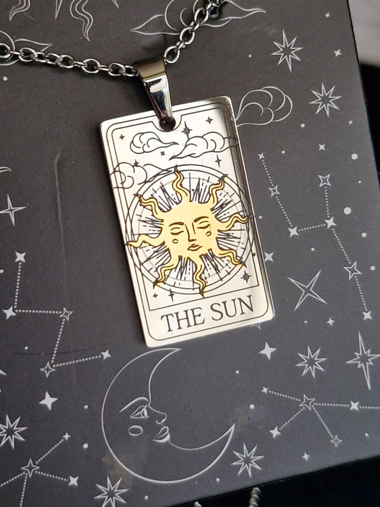 Sun and Moon tarot pendant inspired by the major arcana tarot cards, this magickal double sided pendant depicts The Sun and The Moon tarot cards. Stainless steel.
