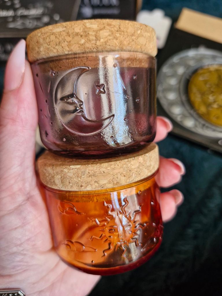 Sun and Moon water stacking jars harness the solar and lunar energies by creating magickal water to use in your craft. And they stack too. Glass jars with Cork lid, each with a Sun or Moon symbol on the glass.