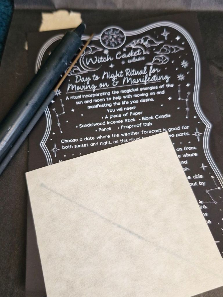Day to Night Ritual for moving on and manifestating Ritual Kit this Ritual Kit contains all you need to perform a Ritual incorporating the magickal energies of the sun and moon to help with moving on and manifestating the life you desire. It has a piece of paper, black candle, Sandalwood incense stick, full instructions.