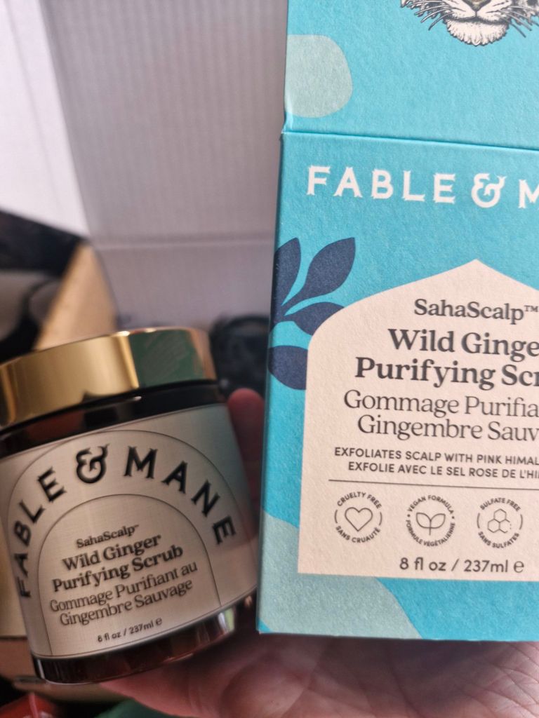Fable and Mane SahaScalp wild ginger Purifying scrub. To cleanse, purify and refresh your scalp with this luxurious scrub shampoo. Enriched with healing anti fungal need and antioxidant rich wild ginger, this scrub transforms into a soft lather to remove product build up, flakes and impurities from the scalp and roots.