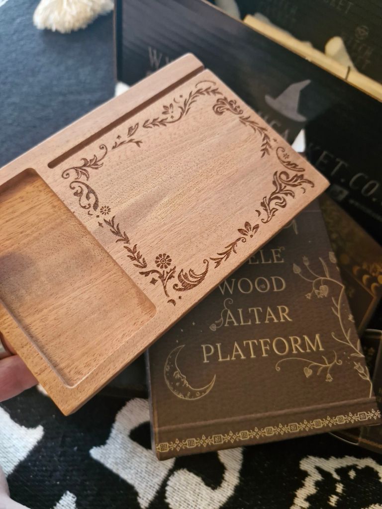 Sapele wood altar platform can be used as a miniature casting table, or pedestal for altar tools, or for offerings, and even has a slot to hold your tarot or oracle card, or art prints to bring a focal point on your altar. Sapele wood used for its healing, growth and Intuition properties.