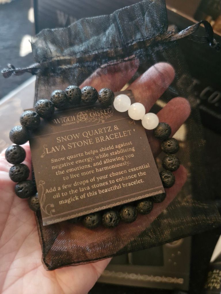 Snow Quartz and Lava Stone bracelet the Snow quartz helps to shield against negative energies, while stabilising emotions, and allow yourself to live more harmoniously, w9ven together with the grounding energies of lava stone, this is truly portable magick. Add a few drops of your chosen oil to the lava stones to further enhance the power of this bracelet.