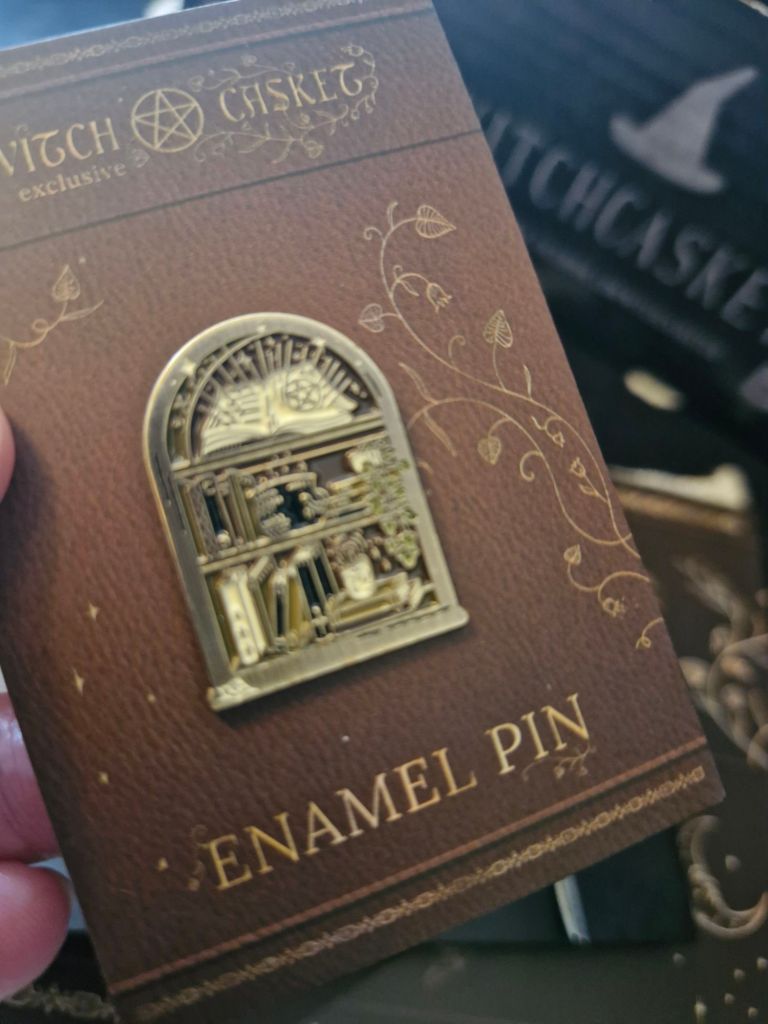 Higher ‘Shelf’ enamel pin a charming and enchanting pin of a magickal bookcase, brimming with witchy books and treasures. It matches the art print below.