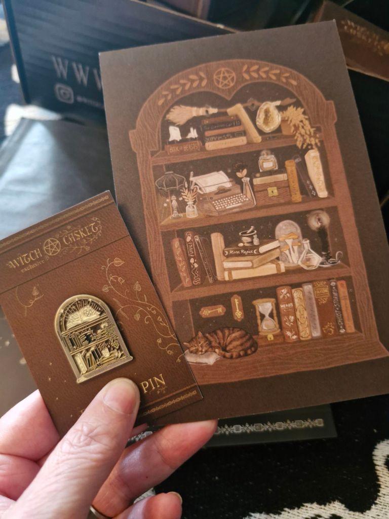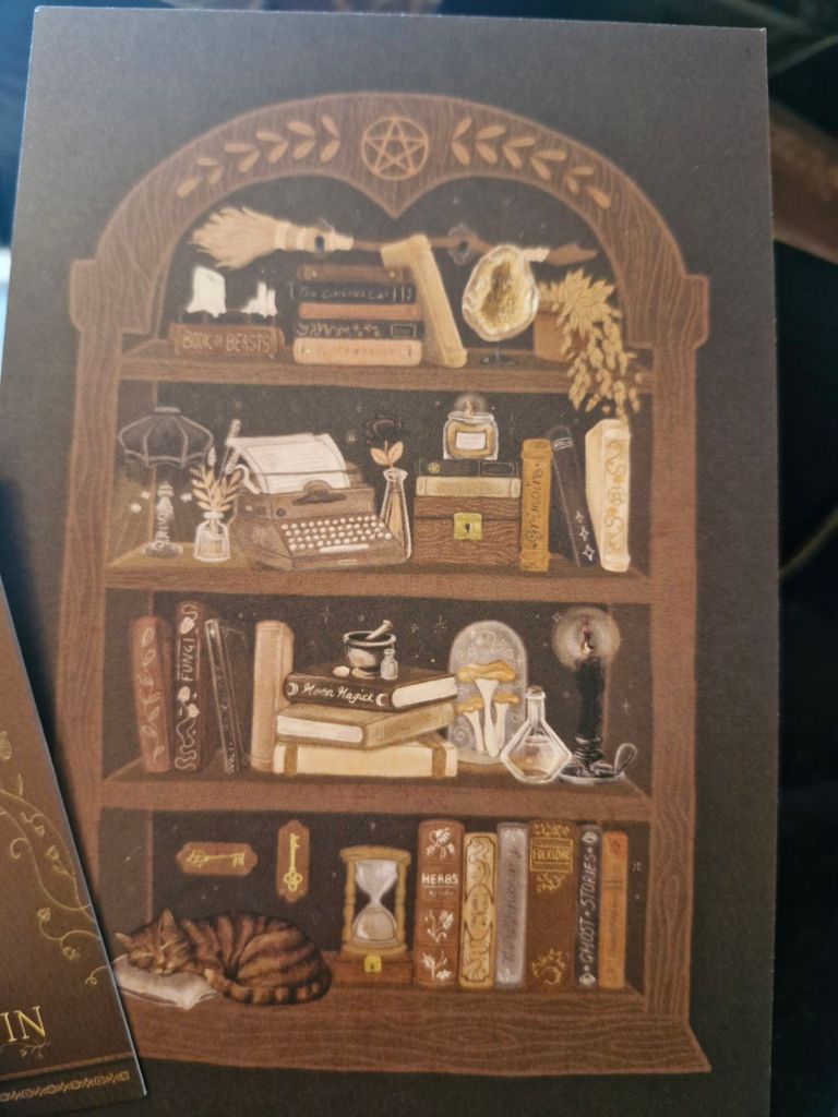 Art print this month it matches the pin, a bookcase holding all the magickal books needed,with trinkets and treasures and furry friends.