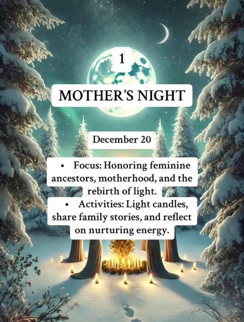 Starting today on the 20th December. It’s the 12 Days of Yule, Each has a name and theme, and here we share what we can do to honour each day. And it starts with Mothers Night