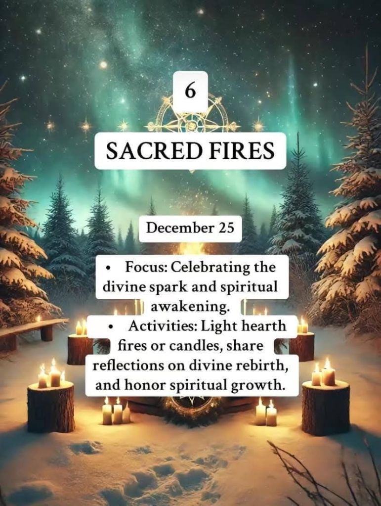 Light & Fire: Symbolized by candles, bonfires, and the traditional Yule log, representing the returning light.