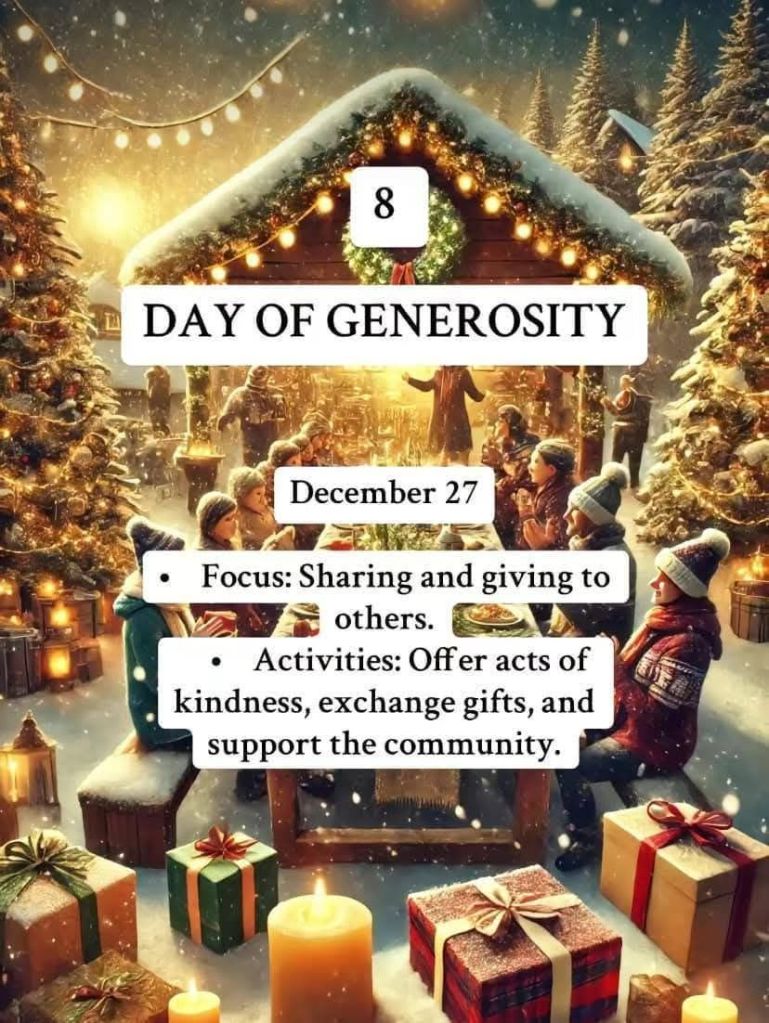 Fifth Day Theme: In some interpretations, the fifth day (around December 25th) is focused on community and sharing small gifts, food, or kind words with friends and neighbors.