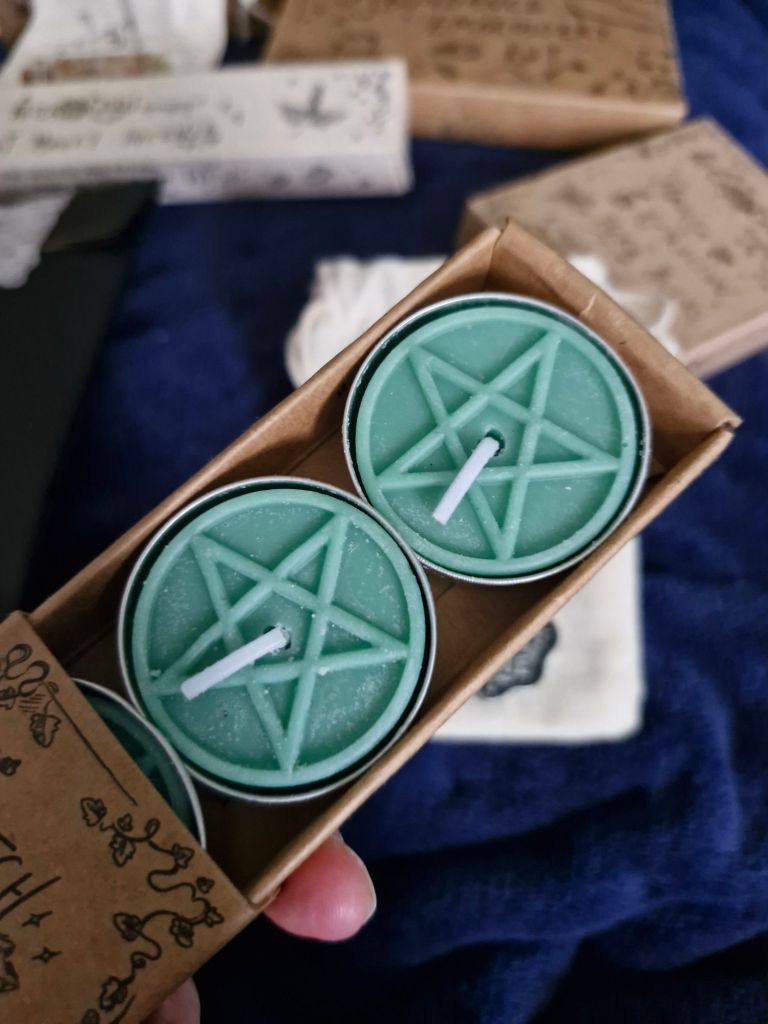 Pentacle Tealight Candles Tealights are a perfect way to bring some simple candle magick to your home. Green is well used as a colour for money, good fortune, healing. The pentacle is to represent protection and prosperity.