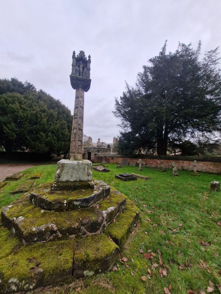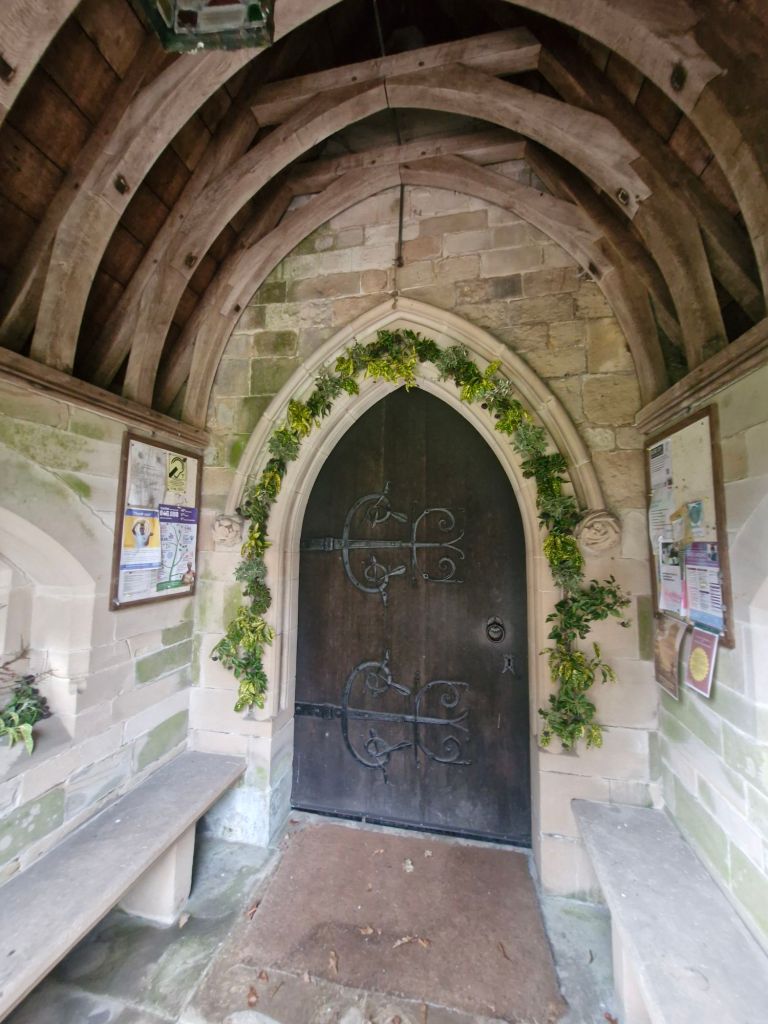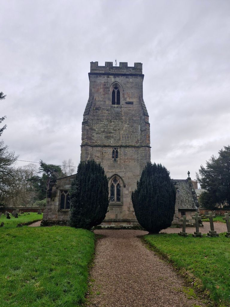 St Leonard’s is of pinkish grey sandstone and consists of a nave with aisles and a tall clerestory, a chancel with a polygonal N vestry and a W tower. The four-bay nave arcades are mid-13thc. work, with cylindrical piers, moulded capitals and pointed arch with chamfered orders. The aisle windows are 14thc. square-headed double lights and there is a S doorway with a porch by Street (1860). The nave was heightened and the tall clerestory added around 1500. The chancel is ofc.1300 or slightly later, with Y-tracery windows and ogee tracery in the piscina. In the S wall outside is a niche tomb that has been identified as that of Richard de Blithfield, rector fromc.1185-1234. On the N side of the chancel, the polygonal vestry dates from 1829-30. It was built as a mortuary chapel for the Bagot family, and is liberally supplied with Bagot memorials. Other Bagot tombs stand in the chancel itself. The W tower is of two storeys, 14thc. below and 15thc. above with diagonal buttresses and a battlemented parapet. The chancel was restored to Pugin’s designs in 1851, and the work included replacing the timber roof and the E window. An attractive, simplified S view ofc.1770 in the William Salt Library (SV II 53) shows the church without its porch and apparently lacking a chancel roof. In Buckler’s 1824 SE view (SV II 46) the porch is also lacking and the chancel is heavily overgrown with creeper. His NE view of the same year (SV II 48) shows the N side before the polygonal mortuary chapel was added. Other antiquarian views are noted in the bibliography. The church contains a 12thc. pillar piscina that has been ingeniously converted for use as an offertory box, and is thus prominently sited opposite the S nave doorway.