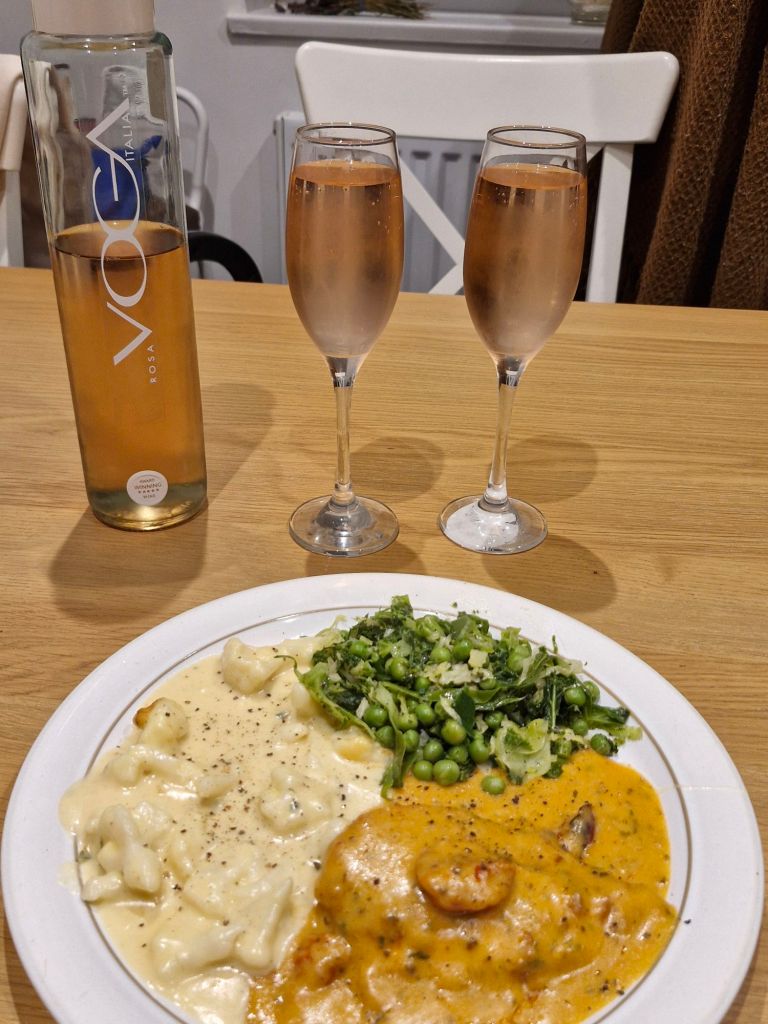 We had a Marry me chicken, with green veggies and cauliflower cheese for Valentines day.